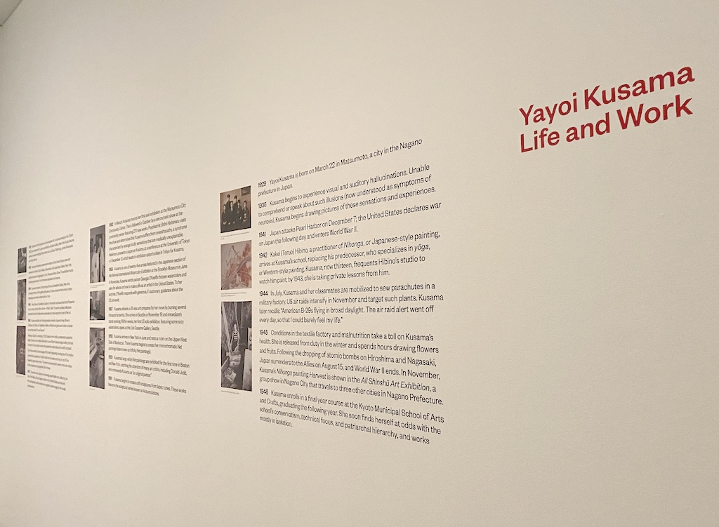 Other elements of the exhibit are also really interesting. Don’t miss the timeline of Kusama’s life and work, which is fascinating. You can learn that she sewed parachutes in a military factory during World War II, how she wrote a letter to Georgia O’Keefe seeking advice on being an artist in the US (and got a response), that dots have been part of her work for a long time, she has written novels, and many more interesting details of her personal and artistic history.