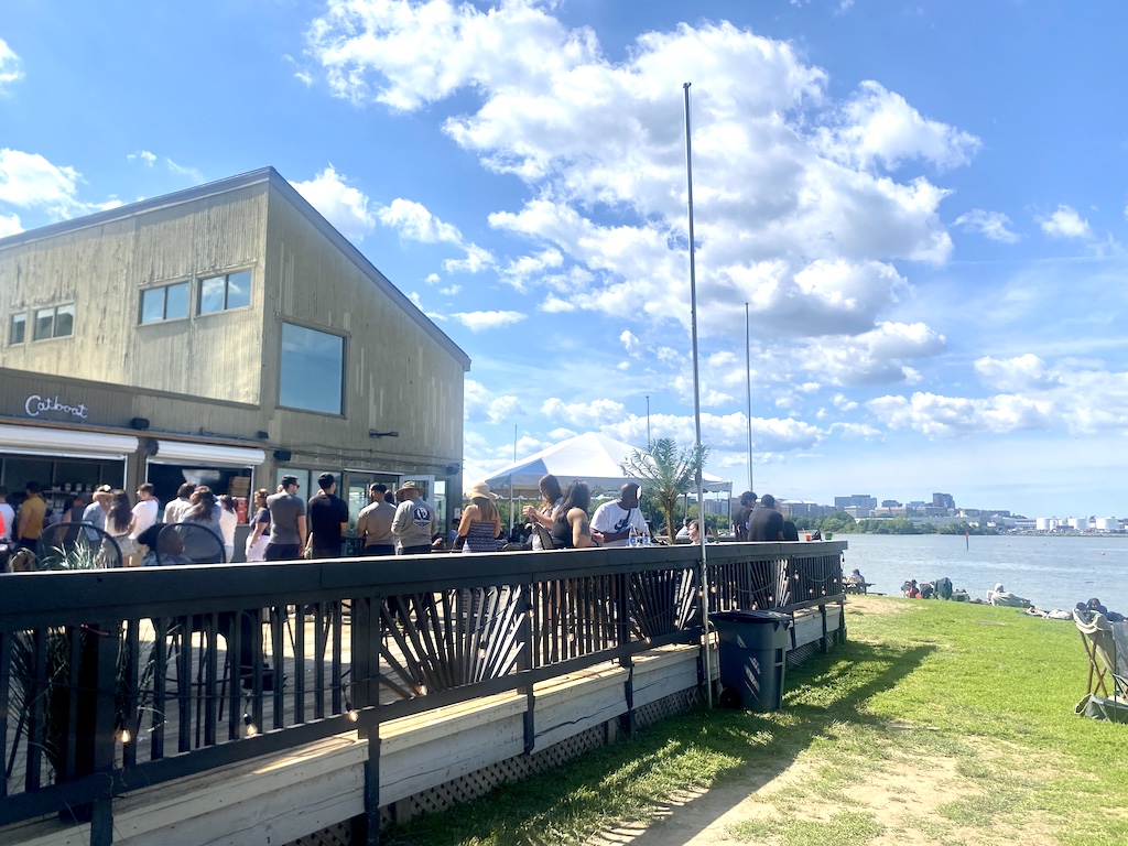 Catboat is located right on the banks of the Potomac, just off the GW Parkway between DCA and Old Town Alexandria at the Washington Sailing Marina. It’s set well off the busy road, with the open counter where you order and large wrap-around deck facing the river. If not for its sweeping, scenic views of DC, it would feel a world away from the bustling city.